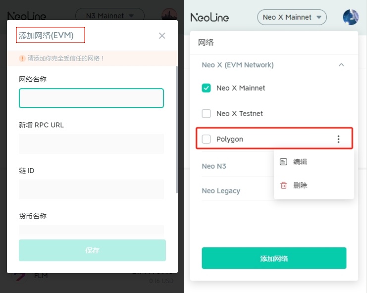 2. 自定义添加的其他网络将显示在 Neo X 下方！