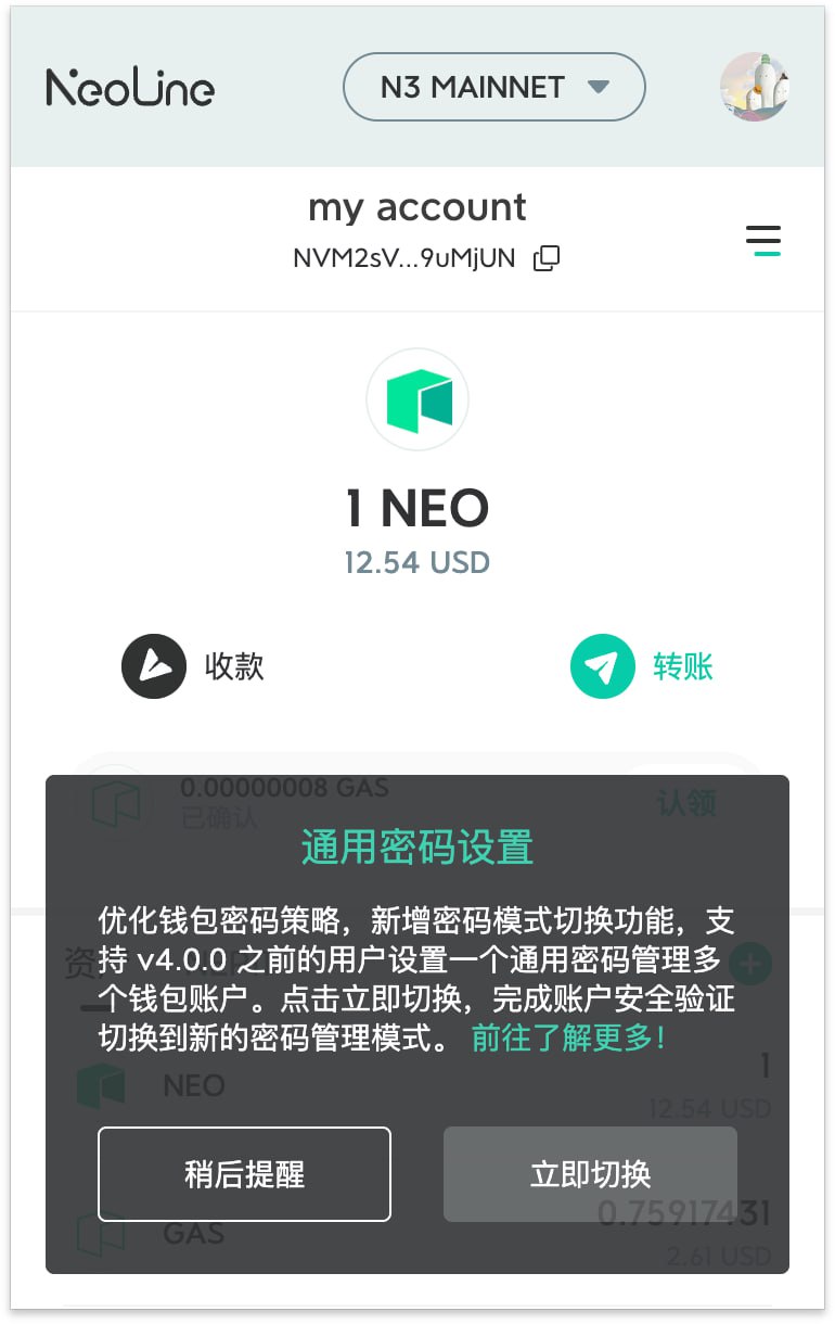 NeoLine 钱包作为安全、友好、专业的 Neo 钱包，一直秉承着为 Neo 社区用户提供安全、便捷、完善的入口服务。在 NeoLine 插件钱包最新版本中，我们对钱包密码策略进行了优化，改变了之前一个钱包账户对应一个密码的模式，迭代为由一个通用密码管理所有的钱包账户。