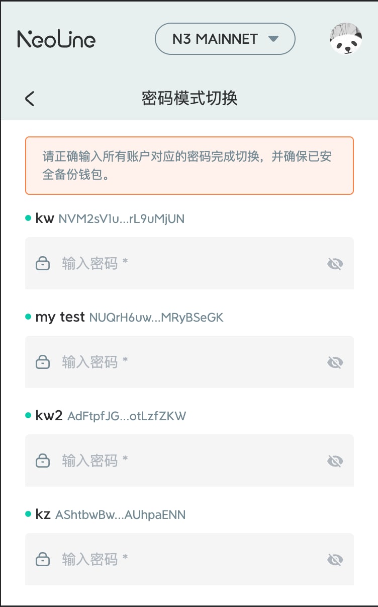 NeoLine 插件钱包 v4.0.0 版本新增密码模式切换功能，支持用户设置一个通用密码管理多个钱包账户。此功能只针对 v4.0.0 之前的钱包用户，一旦完成钱包密码模式切换，将长期保持该密码模式。